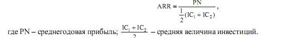 где Io – единовременные затраты (первоначальные инвестиции); Si – годовой доход, обусловленный единовременными затратами, распределённый равномерно по периодам. Если доходы распределены по годам не равномерно, то срок окупаемости рассчитывается по правилу, рекомендуемому для расчёта дисконтированного срока окупаемости. 2. Метод расчёта коэффициента эффективности инвестиций, ARR (accounting rate of return): Если по истечении срока реализации анализируемого проекта допускается наличие остаточной или ликвидационной стоимости, то она вычитается из средней величины инвестиций. Среди всех существующих методов оценки инвестиционных проектов наиболее предпочтительными являются: − метод определения чистой текущей стоимости проекта; − метод расчёта внутренней нормы прибыли; − метод расчёта индекса рентабельности инвестиций; − дисконтированный срок окупаемости. Контрольные вопросы: