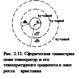 Формула (2.30) аналогична (2.19). При выводе основных кинетических уравнений роста кристалла из расплава сначала допускается, что коэффициент теплопроводности кристалла описывается сферой и холодильник точечных размеров поглощает выделяющееся в системе тепло, будучи помещен в центре кристаллической затравки сферической формы, т.е. симметрия поля температурного градиента в зоне роста кристалла будет шаровой (рис. 2.11). Пусть радиус кристалла, который в некоторый момент равен h, через время dt становится h + dh = h + λdt. Количество вещества, перешедшего в кристаллическую фазу за время dt, равно объему новообразовавшегося шарового слоя, умноженному на плотность кристалла: dm = 4πρh2dh = 4πρh2λdt (2.31). Скорость перехода в кристаллическую фазу