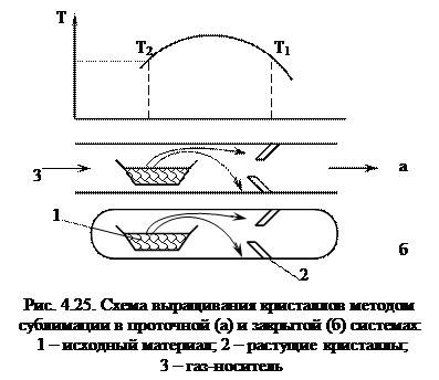 Аппаратурное оформление метода разнообразно. Различают проточные методы с использованием инертного газа-носителя; замкнутые системы как вакуумированные, так и заполненные газом. В левой зоне трубки (рис. 4.25) происходит испарение, в правой – конденсация. Сначала нагреваются обе части трубки до одинаковой температуры и устанавливается давление насыщенных паров, соответствующее этой температуре. Затем понижают температуру в правой части трубки до значения Т1, благодаря чему давление пересыщенного пара здесь становится выше давления только насыщенных паров при температуре Т2. Медленным понижением температуры увеличивают пересыщение до тех пор, пока не возникнут зародыши кристаллов. Рост на поверхности зародыша осуществляется при меньшем пересыщении, чтобы избежать образования новых зародышей.