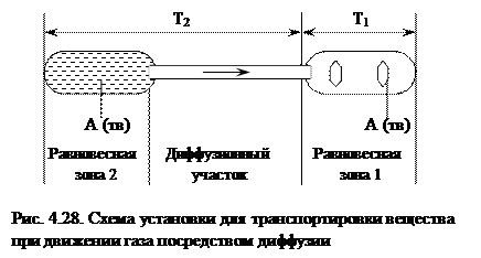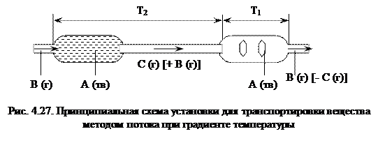 Применение метода потока целесообразно в тех случаях, когда реакция протекает с большой скоростью и приводит к достаточно полному выделению транспортируемого вещества. В методе потока используются сравнительно несложные установки, предусматривающие зоны прямой и обратной реакции в зону транспорта вещества при градиенте температуры. В зону прямой реакции вносят мелкогранулированное вещество исходной – первичной твердой фазы для обеспечения полного с ней взаимодействия газа-транспортера. Если же скорость реакции между газом-носителем и исходным веществом мала или же если приходится работать при повышенной скорости газового потока, то нужны большие количества первичной твердой фазы и более длинные реакционные зоны (рис. 4.27). Менее часты методы потока в условиях перепада давления. Для этого газообразные продукты реакции пропускают через сопло, при выходе из которого равновесие смещается в направлении, способствующем обратному выделению вещества А. Аналогичное воздействие оказывает и примешивание инертного газа. Перепад температуры и давления может применяться одновременно.