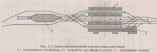 Пассажирские станции (начальник станции — ЛС) предназначены для выполнения операций с пассажирскими поездами. На пассажирские станции возлагаются также ремонт, экипировка, формирование и отстой составов пассажирских поездов, заблаговременная их подача под посадку и отправление строго по расписанию. Пассажирские станции сооружаются в административно-хозяйственных и промышленных центрах, в курортных районах, на стыковых пунктах железнодорожного и автомобильного транспорта и мл магистральных направлениях со значительным пассажирским движением. По характеру выполняемой работы пассажирские станции делят: - на собственно пассажирские, где производятся операции по обслуживанию пассажиров, приему, отправлению и пропуску поездов, а также все коммерческие операции по оформлению проезда пассажиров и перевозок багажа и грузобагажа; - технические пассажирские, имеющие пути и устройства для экипировки, переформирования, ремонта, дезинфекции и отстоя пассажирских составов, деповские и другие устройства для ремонта вагонов. Эти станции предназначены главным образом для выполнения операций с составами поездов, начинающих и заканчивающих следование; - объединенные, выполняющие все операции по пассажирскому движению. В зависимости от схемы путевого развития различают пассажирские станции сквозного, тупикового и комбинированного типов. Через станции сквозного типа поезда могут следовать напроход. На сети железных дорог России большинство пассажирских станций являются сквозными. На тупиковых станциях приемоотправочные пути заканчиваются тупиками. Транзитные поезда через такие станции пропускают с и членением направления движения. Комбинированные имеют сквозные и тупиковые приемоотправочные пути. Тупиковые пути пути используются главным образом для пригородного движения.