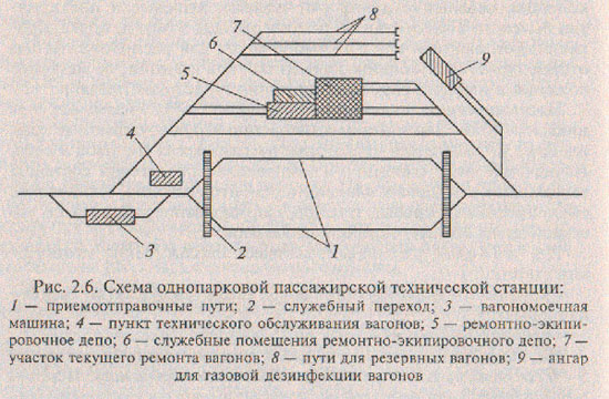 По характеру обслуживаемых поездов станции подразделяют на транзитные, смешанные и конечные. Транзитные станции обслуживают в основном транзитные поезда, смешанные — поезда всех категорий (в том числе транзитные) и конечные — поезда, заканчивающие или начинающие движение на данной станции. Пассажирские станции обслуживают пассажиров дальних, местных и пригородных поездов. При значительных потоках пассажиров пригородных поездов для их приема и отправления оборудуются отдельные пути и платформы. На участках со значительным пригородным движением в пунктах спада пассажиропотоков создаются зонные станции, предназначаемые для оборота пригородных составов. На пригородных участках для посадки-высадки пассажиров устраивают остановочные пункты. Основные устройства пассажирских станций: вокзал, путевое развитие, устройства для багажа и почты. Вокзал представляет собой комплекс зданий и сооружений для обслуживания пассажиров, включающий привокзальную площадь, пассажирское здание, платформы, навесы, переходные тоннели, конкорсы, переходные мостики, вспомогательные сооружения, малые архитектурные формы, предназначенные для ориентирования и создания более комфортных условий, электрические часы, торговые палатки, указатели направлений к местному транспорту и достопримечательным местам и др. В пассажирском здании размещаются залы ожидания, билетные кассы, багажные помещения и камеры хранения ручной клади, справочное бюро, комнаты матери и ребенка, комнаты отдыха, почта, телеграф, бытовые (ресторан, парикмахерская и др.) и административно-служебные помещения. Планировка помещений вокзала должна обеспечивать поточность следования пассажиров, разделение пассажиропотоков по прибытию и отправлению, дальнему и пригородному сообщению, безопасность прохода пассажиров к поездам и от поездов. В зависимости от объема работы по обслуживанию пассажиров вокзалы бывают внеклассные, а также I, II и III классов. В зависимости от взаимного расположения пассажирских зданий и перронных путей вокзалы подразделяют на четыре типа: тупиковые, боковые, островные и смешанные. Путевое развитие включает в себя пути для приема и отправления поездов, производства маневров и временного отстоя отдельных вагонов (служебных, беспересадочного сообщения и т.п.). Устройства для багажа и почты включают в себя багажные кассы, склады, платформы, тоннели для перемещения багажа и почты. На пассажирских станциях могут предусматриваться отдельные устройства туристских поездов (пути отстоя, канализационные колодцы, освещение платформ, туалеты, душевые и предприятия бытового обслуживания: ремонт одежды и обуви, почта, прокат спортинвентаря и т.п.). Выбор места для расположения баз отстоя туристских поездов зависит от типа станции, ее местоположения в городе и размеров движения туристских поездов. Пассажирскими техническими станциями (ПТС) называют специальные одно- или многопарковые станции, оборудованные комплексом устройств для подготовки пассажирских составов в рейс. Назначение этих станций — комплексная подготовка составов, выполнение текущего и планового ремонтов вагонов, техническое обслуживание резервных вагонов, формирование составов по утвержденным схемам, экипировка вагонов. По объему работы различают пассажирские технические станции: - 