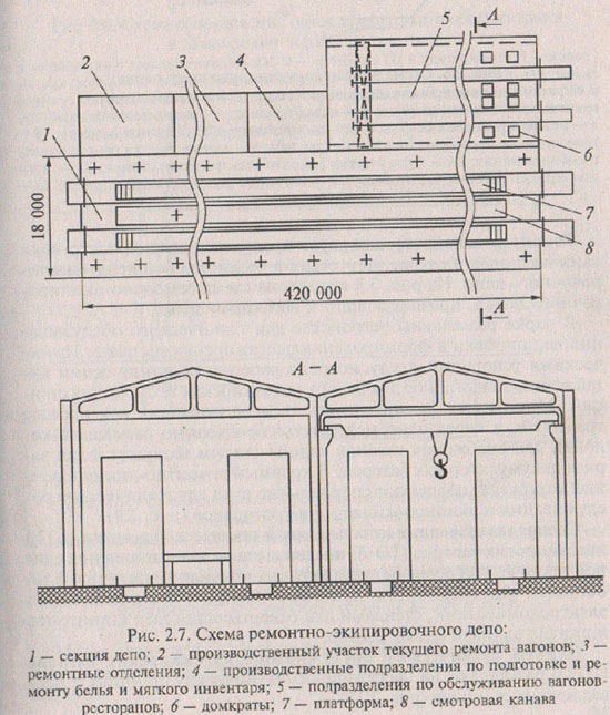 Ремонтно-экипировочные депо (РЭД) предназначены для выполнения комплекса работ по подготовке в рейс пассажирских составов. Размещают РЭД на пассажирской технической станции, а при отсутствии станции — в одном из парков пассажирской станции или на одной из станций, входящих в железнодорожный узел. РЭД представляет собой крытое помещение (ангар), в котором размещают пассажирские составы для технического обслуживания и экипировки. В пристроенных к нему зданиях находятся производственные участки, в том числе для текущего ремонта вагонов, а также служебно-бытовые помещения. Типовыми проектами предусмотрены РЭД длиной 420 или 542м, вмещающие по длине 16 или 20 вагонов, а также длиной 258 м, вмещающий один состав на два пути. В случае проектирования РЭД на два пути здание выполняют однопролетным, а на четыре пути — двухпролетным. Схема (план) типового РЭД приведена на рис. 2.7. Ширина РЭД на два пути стандартная — 18 м. В типовом РЭД размещают ремонтные отделения: кузнечное, сварочное, жестяницкое, столярное, стекольное, малярное, ремонта воздушных фильтров, электроремонтное, аккумуляторное, радиоаппаратуры, холодильников и кондиционеров и т.д. Здесь же находятся подразделения по подготовке инвентаря, продуктов и технических средств для обслуживания пассажиров: склады оборудования, прачечные, ремонтные мастерские, склады баллонов с хладоном, колонки для заправки вагонов водой, вагонов-ресторанов — дизельным топливом, склады продуктов и т.д.