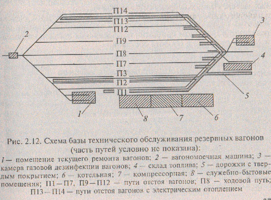 Междупутья приемоотправочных путей для транзитных поездов через одно оборудованы посадочными платформами для пассажиров. Свободные от платформ междупутья используют для технических целей: снабжения вагонов водой и топливом, хранения запасных частей. На пассажирских станциях и посадочных платформах тупикового типа или посадочных платформах в пределах железнодорожного узла вблизи от пункта формирования (пассажирской технической станции или ремонтно-экипировочного парка) для поездов своего формирования операции по техническому обслуживанию вагонов не предусмотрены (ПТО нет). Назначение специализированных путей текущего ремонта пассажирских вагонов в проходящих поездах — текущий ремонт вагонов, требующих отцепки от проходящих поездов. Вагон отцепляют от состава, подают на специализированный путь, а после ремонта прицепляют обратно. Смену колесных пар производят без высадки пассажиров. Специализированный путь обеспечен средствами механизации. Базы технического обслуживания резервных пассажирских вагонов предназначены для разгрузки пассажирских технических станций, ускорения обработки пассажирских составов и обеспечения сохранности вагонов в период отстоя. База представляет собой тупиковую железнодорожную станцию или парк станции, приспособленный для отстоя и технического обслуживания пассажирских вагонов. Базы разделяют на три категории по количеству обслуживаемых вагонов: 1-я — на 600 ватонов; 2-я — на 300 вагонов; 3-я -менее 300 вагонов. Длина и количество путей определены из условия размещения на каждом пути двух составов по 25 вагонов. На базах первой категории размешают моечную машину для наружной обмывки вагонов, камеру газовой дезинфекции вагонов, пути текущего отцепочного ремонта вагонов; пути, оборудованные устройствами для электрического отопления вагонов; компрессорную и котельную или теплопункт. Междупутья через одно устроены с твердым покрытием для движения тракторов и электрокар. На междупутьях без покрытия размещают колонки холодной и горячей воды, воздухоразборные, заряда аккумуляторных батарей. Базы размещают вблизи крупных железнодорожных узлов. Схема базы первой категории приведена на рис.2.12.