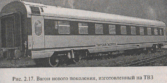 Для нового вагона на основе современной электронной микропроцессорной техники создана система управления и диагностики, которая обеспечивает автоматический сбор, передачу и хранение информации о состоянии оборудования, узлов и агрегатов вагона; выдачу рекомендаций персоналу поезда. Для пассажиров предусмотрены аудио- и видеоинформационная системы. Испытания показали, что по прочности, изгибной жесткости, ходовым качествам скоростной вагон превосходит выпущенные ранее модели. На Тверском вагоностроительном заводе разрабатывается техническая документация на скоростные вагоны различных типов. Принятая конструкция кузова и ходовых частей рис. 2.17 в дальнейшем, после отдельных доработок, сможет обеспечить скорость до 250 км/ч.