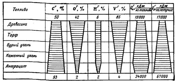 Рисунок 1.2 – Изменение элементарного состава горючей массы и теплоты сгорания основных видов твердого топлива