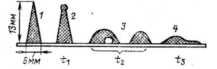 Рисунок 1.3 – Определение вязкости золы топлива по состоянию золовой пирамидки: 1 – до нагревания; 2 – начало деформации; 3 – размягчение; 4 – жидкоплавкое состояние.