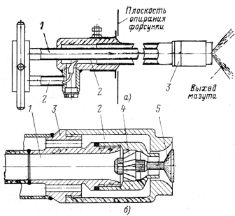 Рисунок 2.11 – Мазутная форсунка парового распыливания: а – малая форсунка; б – средняя форсунка; 1 – колодка; 2 – топливный штуцер; 3 – зажимной винт; 4 – паровой штуцер; 5 – топливная труба; 6 – паровая труба; 7 – сопло; 8 – диффузор; 9 – насадка.