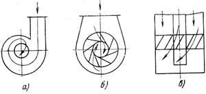 Рисунок 2.13 – Схемы воздушных регистров: а – улиточный; б – тангенциальный лопаточный; в – аксиальный лопаточный.