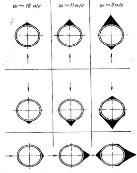 В составе золы имеются в небольшом количестве легкоплавкие соединения с температурой плавления 700 – 850 оС. Это в основном хлориды и сульфаты щелочных металлов [NaCl, Na2SiO3, CaCl2, MgCl2, Al2(SO4)3]. В зоне высоких температур ядра факела они переходят в парообразное состояние и затем конденсируются на поверхности труб, так как температура чистой стенки всегда менее 700 оС. Среднеплавкие компоненты золы с температурой плавления 900 – 1100 оС [FeS, Na2SiO3, K2SO4 и др.] могут образовать первичный липкий слой на экранных трубах и ширмах, если в результате не налаженного топочного режима факел будет касаться стен топки, и вблизи экранных труб будет находиться высокотемпературная газовая среда. Тугоплавкими компонентами золы являются, как правило, чистые окислы [SiO2, Al2O3, CaO, MgO, Fe2O3 и др.]. Температура их плавления (1600 – 2800 оС) превышает максимальную температуру ядра факела, поэтому они проходят зону горения без изменения своего состояния, оставаясь твердыми. Ввиду малых размеров частиц эти компоненты в основном уносятся потоком газов и составляют летучую золу. В зоне высоких температур газов (выше 700 – 800 оС) на поверхности чистой трубы вначале происходит конденсация из газового потока легкоплавких соединений и образуется первичный липкий слой на трубах. На него одновременно налипают твердые частицы золы. Затем он отвердевает и становиться плотным первоначальным слоем отложений, крепко сцепленным с поверхностью трубы. Температура наружной поверхности слоя повышается и конденсация прекращается. Далее на шероховатую поверхность этого слоя набрасываются мелкие и твердые частицы тугоплавкой золы, образуя внешний сыпучий слой отложений. Таким образом, в этой области температур газов на поверхности труб чаще всего присутствуют два слоя отложений: плотный и сыпучий. Сыпучие отложения распространены в зоне относительно низких температур газового потока (менее 600 – 700 оС), характерных для поверхности конвективной шахты. Сыпучие отложения преимущественно образуются на тыльной стороне трубы по отношению к направлению газового потока, в образующейся сзади трубы вихревой зоне (рисунок 3.32). На лобовой стороне сыпучие отложения образуются лишь при малых скоростях потока (менее 5 – 6 м/с) или при наличии в потоке очень тонкой летучей золы. Частицы золы, участвующие в образовании сыпучих отложений разделяют на три группы. К первой группе относят самые мелкие фракции, так называемые безынерционные частицы, которые настолько малы, что двигаются по линиям тока газов, и поэтому вероятность их осаждения на трубах мала. Предельный размер частиц, относящихся к этой группе, составляет около 10 мкм. Ко второй группе относятся крупные фракции размером свыше 30 мкм. Эти частицы обладают достаточно большой кинетической энергией и при контакте с сыпучими отложениями разрушают их. Третью группу составляют фракции золы размером от 10 до 30 мкм. При обтекании газовым потоком трубы эти частицы преимущественно оседают на ее поверхности и образуют слой отложений. В результате размер слоя сыпучих отложений определяется динамическим равновесием процессов постоянного оседания средних фракций золы и разрушения осевшего слоя более крупными