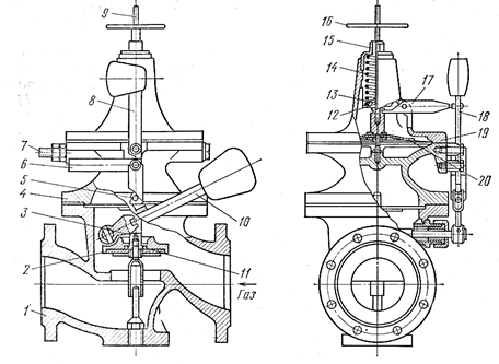Рисунок 3.44 – Предохранительно-запорный клапан ПКН (ПКВ): 1- корпус; 2 – клапан с резиновым уплотнением; 3 – шток; 4 – корпус мембранный; 5 и 18 – штифты; 6 – анкерный рычаг с крючком; 7 – импульсная трубка; 8 – ударный молоточек; 9 – шток мембраны; 10 – рычаг с грузом; 11 – перепускной малый клапан; 12 – гайка штока мембраны; 13 – тарелка; 14 – пружина; 15 – регулировочный стакан; 16 – регулировочный груз; 17 – коромысло; 19 – мембрана.