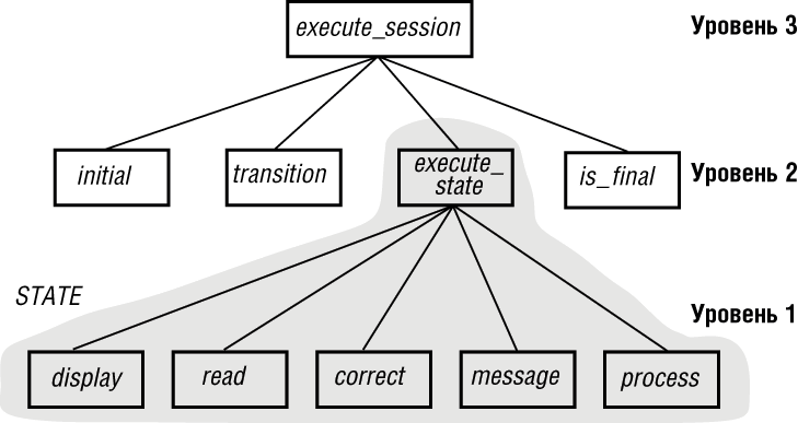 Ранее модули строились вокруг операций (таких как execute_session и execute_state) и данные распределялись между программами со всеми неприятными последствиями, с которыми нам пришлось столкнуться. ОО-проектирование ставит все с головы на ноги, - оно использует наиболее важные типы данных как основу модульности, присоединяя каждую программу к тому типу данных, с которым она наиболее тесно связана. Когда объекты одерживают победу, их бывшие хозяева - функции - становятся вассалами данных. Закон инверсии является ключом получения ОО-проекта из классической функциональной (процедурной) декомпозиции, как это делается в данной лекции. Подобная необходимость возникает в случаях реверс-инженерии, когда существующая необъектная система преобразуется в объектную для обеспечения ее дальнейшей эволюции и сопровождения. К этому приему прибегают в командах, возможно, не столь хорошо знакомых с ОО-проектированием и предпочитающих начинать с привычной функциональной декомпозиции. Конечно, желательно начинать ОО-проектирование с самого начала, - тогда не придется прибегать к инверсии. Но закон инверсии полезен не только в случае реверс-инженерии или для новичков-разработчиков. И в объектной разработке проекта на фоне объектного ландшафта могут встречать области функциональной декомпозиции. Анализ передачи данных является хорошим способом обнаружения и корректировки подобных дефектов. Если вы обнаружили в структуре, разрабатываемой как объектной, образцы передачи данных, подобные состояниям в данном примере, то это должно привлечь ваше внимание и привести в большинстве случаев к осознанию абстракции данных, не нашедшей еще должного места в проекте. Состояние как класс Пример "состояния" является типичным. Такой тип данных, играющий всеобъемлющую роль в передаче данных между программами, является первым кандидатом на роль модуля в ОО-архитектуре, основанной на классах (абстрактно описанных типах данных). Понятие состояния было важным в оригинальной постановке проблемы, но затем в функциональной архитектуре эта важность была утеряна, - состояние было представлено обычной переменной, передаваемой из программы в программу, как если бы это было существо низкого ранга. Мы уже видели, как оно отомстило за себя. Теперь мы готовы предоставить ему заслуженный статус. STATE должно быть классом, одним из властителей структуры в нашей новой ОО-системе. В этом классе мы найдем все операции, характеризующие состояние: отображение соответствующего экрана (display), анализ ответа пользователя (read), проверку ответа (correct), выработку сообщения об ошибке для некорректных ответов (message), обработку корректных ответов (process). Мы должны также включить сюда execute_state, выражающее последовательность действий, выполняемых всякий раз, когда сессия достигает заданного состояния (поскольку данное имя было бы сверхквалифицированным в классе, называемом STATE, заменим его именем execute). Возвращаясь к рисунку, отражающему функциональную декомпозицию, выделим в нем множество программ, принадлежащих классу STATE.