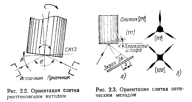 На злитку з погрішністю до 1° і менше необхідно знайти положення плоскості (110), по якій робиться базовий зріз, і плоскості (111), по якій злиток розрізається на окремі частини. Рентгенівський метод. Різко виражений максимум інтенсивності відбиття рентгенівських променів від кристалічної гратки злитка спостерігається у випадку коли кут падіння визначається співвідношенням Вульфа-Брега. 2dsin𝛃=n𝛌 де d – відстань між атомними площинами кристалу; n – ціле число; 𝛌 – довжина хвилі рентгенівського випромінювання; 𝛃 – брегговський гут відображення. Для кожної кристалографічної площині при постійному значенні X характерний свій бреггівського кут, наприклад, для площини [ 111 ] в установці УРС - 50ІМ він становить 17 ° 5б. Розташувавши джерело і приймач відбитого рентгенівського випромінювання під кутом 0 = 180 ° - 2 𝛃, отримаємо максимальну інтенсивність відбитого променя, якщо нормаль до шуканої кристалографічної площини поділить кут 0 навпіл (рис. 2.2). Таким чином, обертаючи злиток навколо своєї осі і в площині розташування джерела і приймача рентгенівського випромінювання (рис. 2.2) і спостерігаючи за інтенсивністю відбитого променя, можна, фіксуючи максимум інтенсивності, знайти положення будь кристалографічної площині. Цей метод найбільш перспективний. Головними його перевагами є: мала трудомісткість, відсутність попереднього травлення злитка і, саме головне, можливість повної автоматизації процесу.