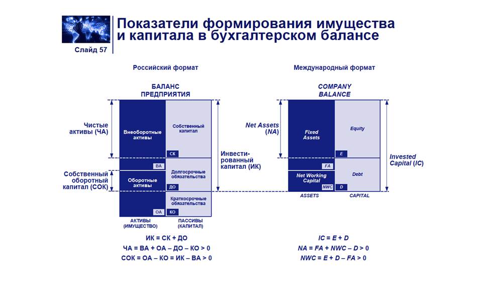 Существуют различия в части формирования имущества и капитала в российском бухгалтерском учете и в бухгалтерском учете по международному формату. Одно из основных отличий в учете капитала состоит в том, что в состав инвестированного капитала по стандартам российского бухучета включается собственный капитал и долгосрочные обязательства (ИК = СК + ДО), тогда как по международным стандартам в состав капитала входят все собственные средства и все обязательства организации (IC = E+D). В российском формате чистые активы — это величина, определяемая путем вычитания из суммы активов организации (принимаемых к расчету) суммы ее обязательств (принимаемых к расчету). ЧА = ВА + ОА-ДО-КО В состав активов, принимаемых к расчету, включаются: • внеоборотные активы, отражаемые в первом разделе бухгалтерского баланса (нематериальные активы, основные средства, незавершенное строительство, доходные вложения в материальные ценности, долгосрочные финансовые вложения, отложенные налоговые активы, прочие внеоборотные активы); • оборотные активы, отражаемые во втором разделе бухгалтерского баланса (запасы, налог на добавленную стоимость по приобретенным ценностям, дебиторская задолженность, краткосрочные финансовые вложения, денежные средства, прочие оборотные активы), за исключением задолженности участников (учредителей) по взносам в уставный капитал. В состав пассивов, принимаемых к расчету, включаются: • долгосрочные обязательства по займам и кредитам, отложенные налоговые обязательства и прочие долгосрочные обязательства; • краткосрочные обязательства по займам и кредитам; • краткосрочные обязательства: кредиторская задолженность, задолженность участникам (учредителям) по выплате доходов, резервы предстоящих расходов, прочие краткосрочные обязательства. В международном учете чистые активы (Net assets) представляют собой разницу между суммой внеоборотных активов (Fixed assets), чистого работающего капитала (NWC) и всеми обязательствами организации. Собственный оборотный капитал предприятия в российском учете - это оборотные активы, которые останутся у компании в том случае, если она должна будет полностью единовременно погасить краткосрочную задолженность предприятия. Таким образом, собственный оборотный капитал представляет собой долю оборотных средств предприятия, свободную от краткосрочных обязательств (или разницу между инвестированным капиталом и внеоборотными активами). СОК = ОА – КО = ИК – ВА. Чистый оборотный капитал необходим для поддержания финансовой устойчивости компании. Превышение оборотных средств над краткосрочными обязательствами означает, что компания в состоянии погасить свои краткосрочные обязательства, и имеет резервы для расширения деятельности. Net working capital в международном учете представляет собой разницу между всем инвестированным капиталом и внеоборотными активами: NWC = E +D – FA. [40]