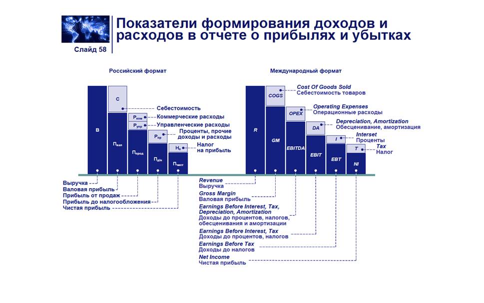 Прибыль как экономическая категория отражает чистый доход, созданный в сфере материального производства в процессе предпринимательской деятельности. Основным источником получения организацией прибыли является выручка от реализации товаров, работ, услуг (В). Выручка от реализации - это денежный доход, полученный предприятием от покупателей или заказчиков за проданную продукцию, за выполненные работы или услуги. Выручка принимается в расчет без налога на добавленную стоимость и акцизов, которые, являясь косвенными налогами, поступают в бюджет. Валовая прибыль (Пвал) представляет собой сумму выручки от реализации продукции предприятия, уменьшенную на величину себестоимости закупки или производства продукции. Посредством уменьшения суммы валовой прибыли на размер коммерческих и управленческих расходов предприятия, высчитывается прибыль от продаж. К управленческим относятся расходы, не связанные с производственной или коммерческой деятельностью предприятия (содержание аппарата управления, арендные платежи и др.), коммерческие расходы – это расходы, как правило, связанные с отгрузкой и реализацией товаров. Следующий показатель прибыли – это прибыль до налогообложения, которая рассчитывается посредством вычета из прибыли от продаж процентов за пользование капиталом, а также разницы между прочими расходами и доходами. Чистая прибыль — часть балансовой прибыли предприятия, остающаяся в его распоряжении после уплаты налогов (налог на прибыль), сборов, отчислений и других обязательных платежей в бюджет. По международному формату исчисления чистой прибыли (Net income) первоначальный показатель выручки снижается на величину себестоимости товаров для получения валовой прибыли (Gross margin). Для получения показателя EBITDA (доходы до процентов, налогов, обесценивания и амортизации) величина валовой прибыли сокращается на размер операционных расходов предприятия. Следующей стадией формирования прибыли является показатель EBIT, рассчитываемый посредством вычета из предыдущего показателя величины обесценивания активов и амортизации, в дальнейшем из него вычитаются проценты к уплате (EBT). Финальный показатель – чистая прибыль (Net income) – формируется после уменьшения показателя EBT на величину всех необходимых налогов и сборов Чистая прибыль используется для увеличения оборотных средств предприятия, формирования фондов и резервов, и реинвестиций в производство. Объём чистой прибыли зависит от объёма валовой прибыли и величины налогов; исходя из объёма чистой прибыли, исчисляются дивиденды акционерам предприятия.[41]