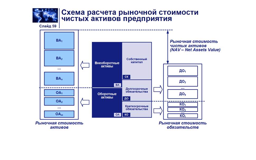 Оценка рыночной стоимости предприятия методом чистых активов является одним из основных механизмов оценки финансового положения компании и основан на определение рыночной стоимости всех видов имуществ предприятия за вычетом его долговых обязательств. Информационной базой метода чистых активов является бухгалтерский баланс предприятия. Оценщик проводит анализ и корректировку всех статей ежеквартального баланса на последнюю отчетную дату для определения рыночной стоимости имеющихся активов. Стоимость предприятия (рыночная стоимость чистых активов) = Рыночная стоимость активов – рыночная стоимость долговых обязательств. Для определения рыночной стоимости активов предприятия оценивается рыночная стоимость движимого и недвижимого имущества предприятия, выявляются и оцениваются нематериальные активы, определяется рыночная стоимость краткосрочных и долгосрочных финансовых вложений, определяется рыночная стоимость материально-производственных запасов, оценивается дебиторская задолженность. К основным видам обязательств предприятия относятся: - долгосрочные \ краткосрочные кредиты банков; - долгосрочные \ краткосрочные займы, полученные у других предприятий; - кредиторская задолженность, оцениваемого предприятия поставщикам и подрядчикам; - задолженность по расчетам с бюджетом; - долговые обязательства предприятия перед работниками по оплате труда и другие; Долговые обязательства в полном объеме переводятся в текущую стоимость исходя из сроков их погашения. В качестве ставки дисконтирования используются модель средневзвешенной стоимости капитала. Определяется рыночная стоимость чистых активов предприятия путем вычитания из рыночной стоимости активов текущую стоимость обязательств (NAV – Net Assets Value) [42]