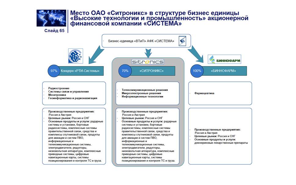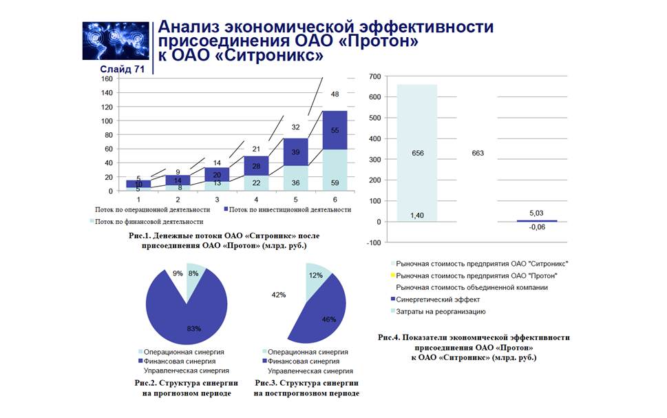 Применительно к бизнесу под синергией понимают пользу, полученную от комбинирования двух или более элементов так, что продуктивность этой комбинации выше, чем сумма продуктивностей ее отдельных элементов. Указанная польза измеряется превышением стоимости объединенных компаний по сравнению с суммарной стоимостью этих компаний до объединения, т. е. добавленной стоимостью, называемой синергетическим эффектом. Прямая синергия возникает при объединении отдельных компаний и характеризует увеличение рыночной стоимости такого объединения сверх суммы рыночных стоимостей компаний до их объединения. Обратная синергия характеризует отрицательный эффект, который возникает при разделении компании, она заключается в падении рыночной стоимости после выхода участников из состава объединенной компании. Синергетические эффекты могут проявиться как напрямую, так и косвенно. Прямая выгода соответствует увеличению денежных потоков, а косвенная – повышению рыночной стоимости акций объединения за счет роста привлекательности для инвесторов. В современных научных публикациях выделяют следующие виды синергии: Операционная синергия представляет собой экономию на операционных расходах или увеличение операционных доходов. Сокращение операционных расходов достигается за счет оптимизации производственных мощностей и снижения себестоимости продукции. Увеличение операционных доходов достигается за счет комбинирования конкурентных преимуществ компаний-участников для создания новых продуктов, объединения маркетинговых усилий и расширения каналов сбыта продукции. Финансовая синергия обусловлена экономией благодаря изменению источников или стоимости финансирования. Этот эффект также связывают с понятием взаимного страхования долга. При объединении компаний их кредиторы получают определенные гарантии, так как при банкротстве одной из объединившихся компаний другая выступит плательщиком долга. Кроме того, крупная объединенная компания получает возможность использовать более широкие возможности для привлечения инвестиций и займов. Управленческая синергия возникает при создании новой системы управления. Она достигается за счет внедрения в объединившихся компаниях единых методов управления, стандартов качества и информационных систем. [46]