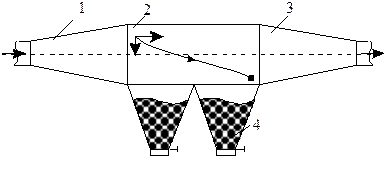 Рис.4.4. Пылеосадительная камера для крупной и тяжелой пыли 1- входной патрубок; 2- корпус; 3- выходной патрубок; 4- бункер