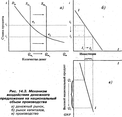 При данном денежном спросе (Dm 1) и предложении денег (Sm 1) процентная ставка устанавливается на уровне i 1. Такой ставке соответствует инвестиционный спрос на уровне I 1 , и объем ВНП= Q 1 . Увеличение предложения до Sm 2 снижает процентную ставку до i 2 , соответственно расширяя инвестиции до I 2 . Прирост инвестиций с мультипликационным эффектом увеличивает ВНП до Q 2 . Таким образом, прирост денежной массы расширяет совокупный спрос, объем производства и доходы, а сокращение денежной массы – понижает. Однако этот вывод справедлив в отношении лишь краткосрочного периода (пока ВНП не достиг потенциального уровня), в более длительном периоде монетарная политика влияет преимущественно на цены. Основными инструментами в руках центрального банка, с помощью которых он воздействует на денежное предложение, как уже отмечалось, являются операции на открытом рынке; изменение учетной ставки и норматива обязательных резервов. Операции на открытом рынке – это купля-продажа центральным банком государственных ценных бумаг. Предположим, что в экономике наблюдается излишний рост денежной массы и центральный банк решает его ограничить. С этой целью он начинает активно продавать государственные обязательства. Предложение ГЦБ увеличивается, их рыночная цена падает, доходность для покупателя растет – спрос на ценные бумаги правительства увеличивается. Клиенты коммерческих банков снимают деньги со своих счетов, происходит замещение денег ценными бумагами. Помимо того, что операции на открытом рынке непосредственно влияют на денежную массу, они порождают вторичный эффект. В результате покупки клиентами ценных бумаг сокращается величина резервов банка и уменьшается сумма кредитов, которую может выдавать банк. Таким образом, конечный результат воздействия операций на открытом рынке на денежную массу включает прямой и вторичный эффекты. Это означает, что продажа центральным банком ценных бумаг, например, на 1000 ден. ед. сокращает объем денежной массы на большую сумму, т.е. имеет место мультипликативый эффект. Операции на открытом рынке – самый распространенный метод воздействия центрального банка на массу денег в обращении. Центральный банк может также влиять на денежную массу, изменяя учетную ставку. Если центральный банк повышает учетную ставку, то для коммерческих банков (в случае возникновения у них дефицита резервов) кредит в центральном банке обойдется дороже, поэтому они постараются увеличить свои резервы, скупая активы или требуя досрочного возврата выданных ссуд. И то, и другое вызовет снижение объема денежной массы. Следует отметить, что в странах развитой рыночной экономики механизм учетно-процентной ставки используется нечасто. Как правило, учетная ставка изменяется вслед за движением процентной ставки на денежных рынках. Если учетная ставка установлена на уровне ниже рыночной, то банки будут стремиться получить дешевый кредит в центральном банке, чтобы использовать его в целях получения прибыли. Кроме того, в условиях интернационализации хозяйства снижение учетной ставки ведет к отливу капитала из страны, что негативно влияет на эффективность учетно-процентной политики. Изменение норматива обязательных резервов. Снижение или увеличение нормы обязательных резервов оказывает воздействие на размер избыточных резервов и 
