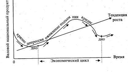 Общая тенденция к расширению производства прокладывает себе дорогу через колебания темпов экономического роста, неравномерность функционирования национальных и мирового хозяйств. Начиная с 1825 г., когда разразился первый экономический кризис, все страны рыночной экономики развиваются циклически. В движении общественного производства есть годы, когда рост общего объема производства происходит высокими темпами, в другие годы медленнее, иногда происходит абсолютное сокращение производства, т.е. экономика периодически переживает периоды подъема и спада. Регулярно повторяющиеся за определенный промежуток времени колебания в движении общественного производства и означают «циклический» характер его развития. Характерная черта цикличности – это движение не по кругу, а по спирали, поэтому цикличность – форма прогрессивного развития. Экономический цикл – это повторяющиеся на протяжении ряда лет колебания различных показателей экономической активности: темп роста ВНП, общий объем продаж, общий уровень цен, уровень безработицы, загрузка производственных мощностей, величина инвестиций и др. Основным свидетельством цикличности развития служат колебания темпа роста ВНП во времени. Как правило, экономика проходит последовательно 4 фазы: подъем, спад (кризис), депрессию, оживление. Графически экономический цикл может быть представлен следующим образом (рис. 15.2):