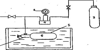 Штуцер 1 при помощи трубок присоединяется к баллону со сжатым воздухом 3, глубинный дифманометр 6 помещается в горизонтальную водяную ванну 5 для проверки герметичности корпуса прибора, а также для контроля температуры. Контроль давления зарядки ведется по образцовому манометру 2, установленному на манифольде 4. По окончании зарядки прибор отсоединяется, наконечник и впускной клапан прибора закрываются.