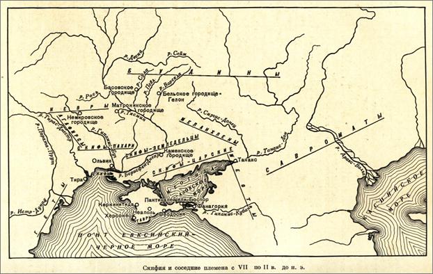 В V в. до н.э. скифы разделялись на ряд племен, границы между которыми не вполне ясны (рис. 1). Главным среди племен Геродот называет “царских скифов”, “самых храбрых и самых многочисленных, считающих всех прочих скифов своими рабами”. Они расселились на огромной территории в междуречье Днепра и Дона, а также в степном Крыму. Указание Геродота на то, что они считали всех прочих скифов своими рабами, по-видимому, свидетельствует о взимании ими дани со своих сородичей. Среди названных им племен таковыми были племена скифов-кочевников, скифов-пахарей, скифов-земледельцев, каллипидов и алазонов. Вопрос о локализации всех этих племен на исторической карте до сих пор остается спорным. Наиболее вероятно, размещение каллипидов и алазонов в районе Бугского лимана близ греческого города Ольвии; скифов-кочевников в степях на восточном берегу Днепра; скифов-земледельцев в излучине этой реки на ее правом берегу, а выше к северу — скифов-пахарей. Любопытны, сходные наименования скифы-земледельцы и скифы-пахари. Слово “пахари” более древнего происхождения в греческим языке, а земледельцы (георги) — более новое, известное со времени Геродота. Так Геродот назвал их для того, чтобы отличить их местное название “борисфениты” от такого же названия жителей города Ольвии. В ранний период своей истории скифы были кочевниками. Переход к земледелию у них начался вследствие изменения экологических условий, социального расслоения общества и влияния греческих городов колоний с конца V в. до н.э. Скифы кочевали по степям в больших четырехколесных кибитках (Табл. 10,14) с огромными стадами скота. В стадах преобладали лошади и овцы. Костяки лошадей в скифских курганах - обычная находка. На поселениях, кроме того, встречаются кости коров и собак. В IV-III вв. до н.э. у племен Приднепровья и Керченского полуострова широко развивается пашенное земледелие. Появляются и укрепленные поселения. В настоящее время выделяются три локальные группы скифских памятников: основная или степная, располагавшаяся от Дуная до Приазовья; нижнедонская, занимавшая устье Дона и крымская. В первой группе важнейшими памятниками являются Каменское городище на Днепре (близ г. Никополя) и царские курганные захоронения, среди которых наиболее значительными являются курганы Солоха, Чертомлык и Толстая могила. Каменское городище возникло в конце V в. до н.э. и занимает площадь около 12 кв. км. По-видимому, это была первая столица скифов. Городище открыто и исследовано Б.Н. Граковым. Здесь выявлено две линии укреплений: внешняя и внутренняя (акрополь). На акрополе открыты остатки домов скифской знати. На основной же территории поселения находились жилища рядовых граждан, представлявшие собой полуземлянки и дома столбовой конструкции, разделенные на несколько комнат. Внутри жилищ находились глинобитные очаги. Перед землянками находились углубленные в землю дворики. Характерной особенностью Каменского городища является обилие находок остатков металлургического производства вокруг каждого дома, что позволило Б.Н. Гракову определить его как поселение металлургов. Городище прекращает свое существование в конце III в. до н.э. На акрополе жизнь продолжается до III в. н.э. Кроме Каменского городища к этой группе относятся Белозерское городище близ г. Херсона и Надлиманское городище на Днестре. Пог