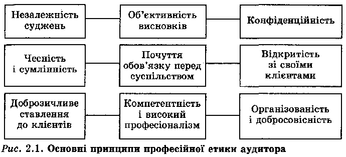 Вказані принципи відповідають вимогам міжнародних нормативів аудиту. Від дотримання цих етичних принципів залежить авторитет фахівця, його професійна придатність виконувати найскладніші завдання. Незалежність – головна риса професії аудитора. Вона обумовлена тим, що аудитор не є штатним працівником державного органу управління, він не підпорядкований іншим контрольно-ревізійним органам або політичним партіям чи громадським організаціям і не залежить від них. Думка аудитора з фінансових питань не має залежати від гонорару, який виплачується клієнтом. Об'єктивність висновків має ґрунтуватися на вдумливому дослідженні діяльності клієнта, використанні достовірних даних, застосуванні оптимальних методів їх аналізу і складання аудиторського висновку за результатами перевірок. У ставленні до клієнта аудитор повинен бути коректним, чемним і передбачливим, а свої зауваження доводити у формі побажань, порад, рекомендацій. Надаючи консультаційну допомогу, аудитор зацікавлений максимально захистити інтереси клієнтів, а отже, не зосереджує своєї уваги тільки на негативних фактах. І у клієнта, і в аудитора спільна мета – зробити посильний внесок у ефективне функціонування соціально-економічних систем. Для аудитора багато важить широка поінформованість у виробничо-економічних справах. Крім того, аудитор не може надавати професійні послуги, не будучи достатньо обізнаним із загальними і технічними стандартами з обліку й аудиту. Конфіденційність – не менш важлива риса професії аудитора. Він зобов'язаний зберігати виробничі й комерційні таємниці клієнтів, не поширювати конфіденційну інформацію, щоб не завдати їм шкоди. За розголошення секретів клієнтів аудитор несе відповідальність за законом і моральну відповідальність перед колегами. Кодекс професійної етики аудитора затверджено рішенням Аудиторської палати України від 18.12.1998 р. № 73. У кодексі, крім розглянутих вище принципів незалежності, об'єктивності й конфіденційності, пріоритетне значення надається фаховості, компетентності аудитора.