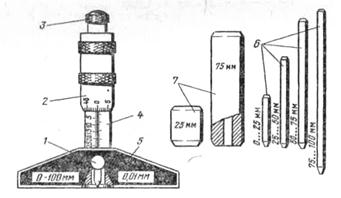 1 – стопорный винт; 2 – микрометрическая головка (барабан); 3 – трещотку; 4 – измерительный стержень; 5 – основание; 6 – сменные измерительные стержни; 7 – установочная мера Рисунок 6 – Микрометрический глубиномер