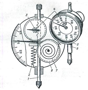 1 – измерительный стержень; 2 – трибка; 3 – двойное зубчатое колесо; 4 – малая стрелка; 5 – накатанный ободок; 6 –гильза; 7 – пружинный волосок; 8 – дополнительное зубчатое колесо Рисунок 7 – Индикатор часового типа