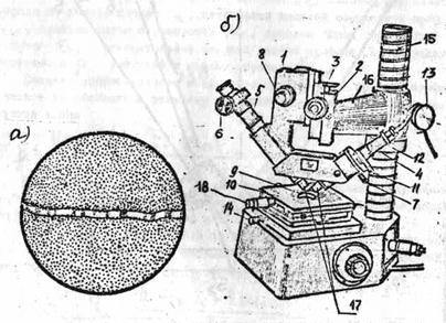 а) – изображение щели (деформированное); б) – устройство микроскопа; 1 – корпус; 2 – кронштейн; 3 – винт; 4 – осветительный микроскоп; 5 – визуальный микроскоп; 6 – окулярный микрометр; 7 – винт осветительного тубуса; 8 – винт для микрофокусировки; 9 – контролируемая деталь; 10 – стол; 11 – кольцо для регулирования ширины щели; 12 – гайка для установки кронштейна; 13 – стопорный винт; 14 – винт для фиксации стола; 15 – стойка; 16 – траверса; 17 - окуляр