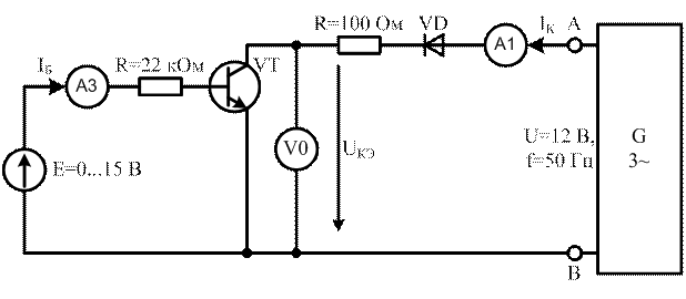 Задание: Исследовать влияние тока базы на вольтамперную характеристику Последовательность выполнения эксперимента: • Соберите цепь согласно схеме (рисунок 4.5). В этой цепи в качестве источника синусоидального напряжения используется линейное напряжение трехфазного генератора, а диод включен для исключения обратного напряжения на транзисторе. Приборы А1, А3 и V0 – входы коннектора, служащие для вывода тока