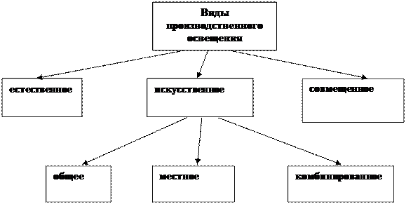 Производственное освещение является элементом условий трудовой деятельности чело- века. Правильно организованное освещение рабочего места обеспечивает сохранность зрения человека и нормальное состояние его нервной системы, а также безопасность в процессе производства. Видимый свет — это электромагнитные волны с длиной волны от 770 до 380 нм (1 нанометр = 10⁻⁹м). Он входит в оптическую область электромагнитного спектра, который ограничен длинами волн от 10 до 340 000 нм. Кроме видимого света в оптическую область входит ультрафиолетовое излучение (длины волн от 10 до 380 нм) и инфракрасное (тепловое) излучение (от 770 до 340 000 нм). Различают следующие виды производственного освещения: естественное, искусственное, совмещенное (рис. 4.2.).