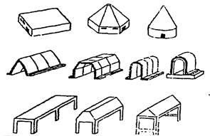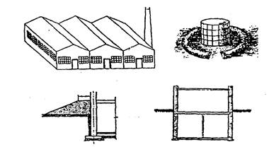 Рис.9.1. Конструктивні особливості, що покращують обтікання об'єктів ударною повітряною хвилею . Для підвищення стійкості елементів ОЕ до світлового випромінювання застосовують вогнетривкі конструкції, матеріали, що не згорають, вогнезахисні обмазки елементів будівлі, що згорають, в якості перегородок застосовуються армовані або бетонні плити. Великі будівлі доцільно розділяти на секції стінами, що не згорають, брандмауерами. Необхідно передбачити можливість герметизації будівель, продовольчих цехів і складів, щоб не допустити проникнення в них радіоактивних, хімічних речовин або бактеріологічних засобів. У складських приміщеннях має бути мінімальна кількість дверей і вікон, а ЛВГЖ і АХОВ повинні розміщуватися в окремих сховищах заглибленого типу. Унікальне і цінне устаткування слід розміщувати в міцніших спорудженнях заглибленого типу. Допускається його розміщення в спорудах з легких конструкцій, що не згорають, під навісами або відкрито, оскільки устаткування стійкіше до дії УВВ, чим до обламань будівлі, що обрушилася (рис.9.2).