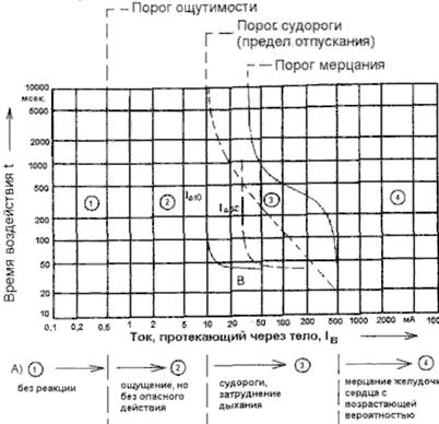 А) Области действия переменного тока 50/60 Гц при различных токах протекающих через тело, и различном времени воздействия. В) Верхняя характеристика отключения при отключении ID. ID10: IDn = 10 mА, ID30: IDn = 30 mА. ПРИЛОЖЕНИЕ 3. В таблице 3.1 даны наибольшие допустимые напряжения прикосновения и токи, проходящие через тело человека, при аварийном режиме производственных электроустановок напряжением до 1000В с глухо заземленной или изолированной нейтралью и выше 1000В с изолированной нейтралью.