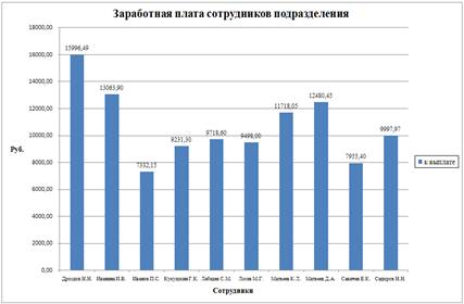 1. Откройте рабочую книгу MS Excel. Возможные приемы: - ярлык MS Excel на рабочем столе Window; - пункт «Программы» главного меню Window; - контекстное меню рабочего стола Window, команда «Создать»; - другие приемы, которые пользователь считает удобным. 2. Присвойте активному листу электронной таблицы имя «Ведомость». Возможные приемы: - контекстное меню ярлычков листов, команда «Переименовать»; - двойной щелчок по имени листа в его ярлычке и ввод нового имени. 3. Разместите в ячейке A1 заголовок таблицы «Расчетно-платежная ведомость». 4. В диапазоне ячеек A2:R4 сформируйте шапку таблицы в соответствии с прилож. 2. 5. В диапазоне ячеек A5:R5 введите нумерацию столбцов таблицы с использованием средства «Автозаполнение». Возможные приемы. 1) Ввести в ячейки A5 и B5 цифры 1 и 2 соответственно. Далее выделить обе ячейки, подвести указатель мыши в правый нижний угол выделенного диапазона и, нажав левую кнопку мыши, растянуть до ячейки R5. Примечание – можно использовать правую кнопку мыши с выбором в появляющемся контекстном меню команды «Заполнить». 2) Использование диалогового окна «Прогрессия», доступ к которому можно получить путем нажатия на кнопку вкладки «Главная». 6. Заполните диапазон ячеек A6:F15 данными для 10 сотрудников подразделения. Данные могут быть аналогичны примеру или сформированы самостоятельно. Для ввода сведений о профессии (должности) могут быть использованы такие средства MS Excel как «Автозаполнение» и команда «Выбрать из раскрывающегося списка» контекстного меню ячейки. 7. Введите расчетные формулы для совокупностей реквизитов «Начислено», «Удержано и зачтено» и «Сумма» в соответствии с прилож.2. Замечания: 1. Ввод всех формул начинается со знака равенства; 2 При формировании однотипных формул следует пользоваться приемом копирования, т.е. выделять ячейку с формулой, подводить курсор в правый нижний угол ячейки и, нажав левую клавишу мыши, растягивать до нужной ячейки; 3. Для формирования итоговых данных целесообразным представляется использование функции «Автосумма», доступ к которой может быть получен на вкладках «Главная» и «Формулы»[1]; 4. Требования к форматированию таблицы: - наличие границ для всех ячеек таблицы; - числовой формат с двумя десятичными знаками для данных, измеряемых в рублях; - выравнивание текста по центру по вертикали и по центру по горизонтали в шапке таблицы. 8. Построите диаграмму по значениям показателя «К выплате», как это показано на рис. 1. Технология построения. 1) Выделить диапазон ячеек R6:R15. 2) Выполнить команду Вставка/Гистограмма и выбрать тип гистограммы «Гистограмма с группировкой». 3) Для полученного макета диаграммы выполнить следующие действия по форматированию. а) Используя команду «Выбрать данные» контекстного меню, изменить имя ряда данных с «Ряд 1» на «к выплате», а также сформировать подписи горизонтальной оси по диапазону C6:C15. Для выполнения этих действий следует использовать кнопку «Изменить» диалогового окна команды «Выбрать данные». б) Выделив диаграмму, с помощью инструментов вкладки «Макет» добавить название диаграммы, подписи ее осей и подписи данных.