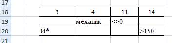 Данный диапазон условий состоит из 3-х строк, первая из которых содержит номера полей, по которым осуществляется отбор записей, а вторая и третья – конкретные условия к этим полям. Внимание. Условия в рамках одной строки критерия поиска находятся в соотношении «И» друг относительно друга, т.е. выполняются одновременно (логическое «И»), а между собой строки критерия поиска находятся в соотношении «ИЛИ» (логическое «ИЛИ»). Другими словами, согласно данному диапазону условий (см. рис. 2) будут найдены механики, которые имеют какие-либо суммы распределенных социальных и материальных благ, или все сотрудники, фамилия которых начинается на букву «И», а сумма профсоюзного сбора - превышает 150 руб. 2) Выберите команду «Дополнительно» вкладки «Данные» и в открывшемся диалоговом окне заполните поля ввода «Исходный диапазон» ($A$5:$G$16), «Диапазон условий» ($C$18:$F$20) и «Поместить результат в диапазон» ($A$22:$R$28). 12. Оценить итоги поиска. Результатом должны стать извлеченные записи с табельными номерами «181» и «186».