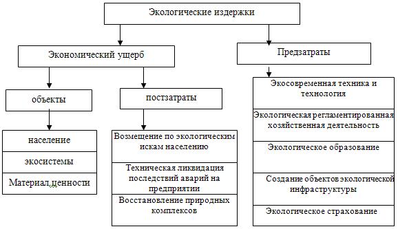 Издержки, связанные с поддержанием природно-ресурсного потенциала (создание особо охраняемых природных территорий, обеспечение воспроизводства возобновимых природных ресурсов в том же количестве и качестве, что и потребленные «порции» ресурсов, использование вторичные ресурсов (отходов производства и потребления) в качестве сырья, разработка и внедрение ресурсосберегающих технологий и т.п.). Издержки общественного развития, к которым относятся затраты на воспроизводство человека, его биологических и социальных качеств (сохранение его экологической ниши — затраты на подготовку отдельных видов природных ресурсов и условий для воспроизводства и жизни населения, ставшие необходимыми в связи с отрицательными антропогенными воздействиями на природную среду, реализацию рекреационных, эстетических потребностей человека и т.д.). С экономической точки зрения все общественные издержки, обусловленные влиянием человеческой деятельности на окружающую среду, можно подразделить на (рисунок 1.): предупреждающие затраты или издержки (пред-затраты); экономический ущерб; затраты на ликвидацию, нейтрализацию и компенсацию допущенных экологических нарушений.