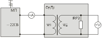 Однофазный трансформатор подключается к нерегулируемому источнику переменного тока «~220» модуля МП. Для создания нагрузки во вторичную цепь трансформатора включается регулируемое сопротивление RP2. Контроль параметров в первичной и вторичной обмотках осуществляется с помощью приборов PV и PA модуля МИ. Опыт проводится в следующем порядке: – включить автоматические выключатели QF1 и QF2 модулей МПС и МП соответственно, трансформатор работает на холостом ходу, данную точку занести в табл. 1; – переключателем SA2 модуля ОдТр изменять ток вторичной обмотки до тех пор, пока ток в первичной обмотке не будет равен I1»I1Н I1Н = где SН – полная мощность (Приложение Г), кВА; U1Н – номинальное вторичное напряжение (Приложение Г), В.