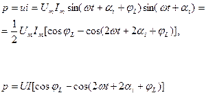 Из полученного соотношения видно, что среднее значение мощности цепи равно ее активной мощности. Активная мощность равна произведению действующих значений напряжения и тока на косинус угла сдвига фаз между ними: