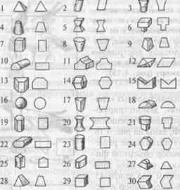 Рис. 4.15. Набор фигур, использованных в тесте на оперирование эмпирической размерностью фигур (по Дашевскому, 1972). Фигуры различались по форме и цвету. 1 — желтые; 2 — бледно-желтые; 3 — темно-серые; 4 — зеленые; 5 — неокрашенные; 6 — голубые; 7 — синие; 8 — темно-зеленые; 9 — желтые; 10— голубые; 11 — серебристые; 12 — зеленые; 13— серые; 14 — бордовые; 15 — сине-зеленые; 16 — красные; 17 — оранжевые; 18 — светло-серые; 19 — черные; 20 — серо-голубые; 21 — малиновые; 22 — темно-розовые; 23 — белые; 24 — малиновые; 25 — золотые; 26 — фиолетовые; 27 — неокрашенные; 28 — светло-розовые; 29 — неокрашенные; 30 — черные.
