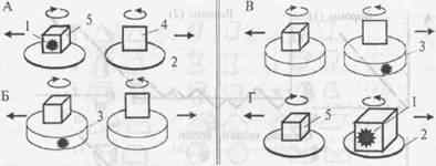 Рис. 4.17. Схемы опыта по оперированию эмпирической размерностью фигур (А), контрольных опытов по выработке дифференцировочного УР на предъявление ОФ и ПФ (Б, В) и по дифференцированию двух объемных фигур разного размера (Г) (см. текст; по Дашевскому, 1979).
