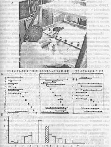 Рис. 4.18. Тест Ревеша—Крушинского. А — обстановка эксперимента на врановых птицах в лаборатории Л. В. Крушинского; Б — результаты решения теста галкой (слева), павианом-анубисом (в середине) и серой крысой (справа); по вертикали отложены предъявления теста; по горизонтали — номера кормушек; положение приманки обозначено квадратом; неправильные реакции животного отмечены ромбами, соединенными линией; правильное (без предварительных ошибок) решение обозначено одиночным квадратом; В — гистограмма распределения первых выборов кормушек (см. текст).