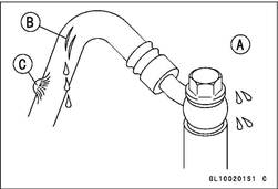 Brake Hose Damage and Installation Condition Inspection • Inspect the brake hose and fittings for deterioration, OThe high pressure inside the brake line can cause fluid to leak [A] or the hose to burst if the line is not properly maintained. Bend and twist the rubber hose while examining it. • Replace the hose if any cracks [B] or bulges [C] are no •Tighten any loose fittings and any banjo bolts. Torque-Brake Hose Banjo Bolts: 34 N·m (3.5 kgf·m, 25 ft·lb)