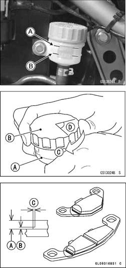 • If the fluid level is lower than the lower level line, fill the reservoir to the upper level line [A] in the reservoir [B]. Change the brake fluid in the brake line completely if the brake fluid must be refilled but the type and brand of the brake fluid that is already in the reservoir are unidentified. After changing the fluid, use only the same type and brand of fluid thereafter. Recommended Disc Brake Fluid • If the rear brake reservoir cap is open to fill the brake fluid, follow the procedure below to install the cap correctly. OFirst, tighten the brake fluid reservoir cap [B] clockwise [C] by hand until the resistance is felt fully; then, tighten the cap an additional 1/6 turn [D] while holding the brake fluid reservoir [A] body. Brake Pad Wear Inspection In accordance with the Periodic Maintenance Chart, inspect the brake pads for wear. • Remove the pads. • Check the lining thickness [A] of the pads in the caliper. • If the lining thickness of either pad is less than the service limit [B], replace both pads in the caliper as a set. Stepped Portion [C] Толщина Выравнивания колодки Сервисный Предел: 1 мм (0.04 в.)