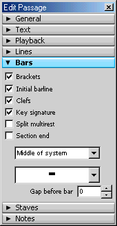 Практически каждый объект партитуры имеет свои свойства, которые могут быть отредактированы различными тонкими способами, и как вы догадываетесь, не без помощи данного окна. В окне 7 вкладок, раскрывающихся при нажатии кнопки мыши на заголовке. Рассмотрим поочередно каждую из них.
