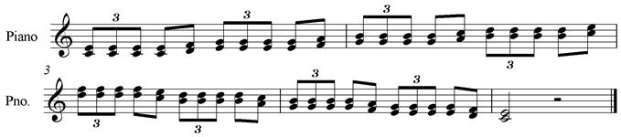 В данном примере приведена партия правой руки фортепиано (ее нам вполне хватит). Начнем набирать сначала верхнюю мелодию (можно и нижнюю, это дело вкуса), а терции добавим потом. Для создания триоли необходимо следующее: сначала вводим восьмую ноту ми и нажимаем клавиши Ctrl+3, в результате чего появляется готовая триоль, в которой только осталось вместо пауз ввести ноты (причем необязательно восьмые, можно и любой длительности, не превышающей длительность триоли):