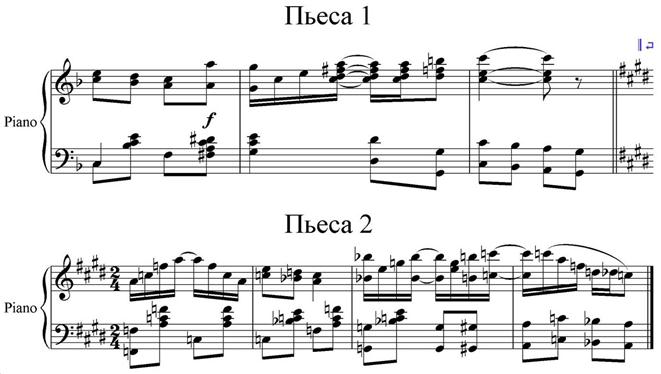 ü Конец секции – инструмент, позволяющий разграничить друг от друга несколько произведений или фрагментов партитуры. Действует совместно с разрывом системы или страницы. Предположим, что в нашей партитуре на одной странице размещены две фортепианные пьесы, имеющие разный размер и тональность. Конечно же, пьесы воображаемые и созданы из той же предыдущей партитуры: