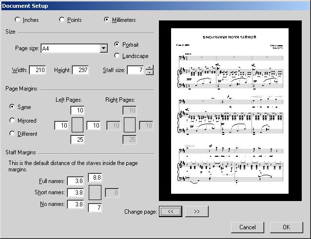 Кажется, довольно неплохо. Однако для «чистоты эксперимента» представим, что набранную партитуру мы передали чрезвычайно вредному редактору, который упрекает нас в том, что мы не экономим бумагу, и требует переделать партитуру так, чтобы она вся уместилась на четырех страницах. С поникшей головой возвращаемся к рабочему месту и думаем: что здесь можно сократить? На помощь приходит замечательная команда: Document Setup («Настройка документа») – вызывается она клавишами Ctrl+D.