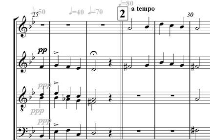 ГЛАВА IV. РАБОТА СО ЗВУКОМ Как вам уже известно, Sibelius – программа двоякого рода: с одной стороны это программа для верстки нотных партитур (подобно текстовому редактору), с другой же стороны – это программа для создания и редактирования музыки. Как уже говорилось ранее, Sibelius при проигрывании «обращает внимание» на указанные вами обозначения динамики и темпа. Конечно же, думать о том, что ваша партитура зазвучит также, как при живом исполнении, было бы наивно. Но можно определенными хитроумными приемами заставить программу исполнять музыку более или менее выразительно. В меню «Play» («Воспроизведение») содержится команда «Dictionary» («Словарь»), открывающая диалоговое окно, в котором указаны слова, которые программа воспринимает как команды, воздействующие на воспроизведение музыки. Здесь можно отредактировать действие каждого слова, а также добавить свои команды и назначить им действия. При этом все слова делятся на две категории: «System text» (текст, воздействующий на всю систему) и «Staff text» (текст, воздействующий на один нотный стан). В приведенном примере скрытые знаки метрономирования (вверху) являются системным текстом, так как под их воздействием мелодия на всех станах изменяет свой темп; каждый же знак рр и ррр воздействует именно на тот нотоносец, к которому он прикреплен, и более того – на мелодию одного голоса, к которому относится сам. Таким образом, здесь удалось выделить более громким нюансом партию альта и приглушить до ррр партии двух теноров и баса.