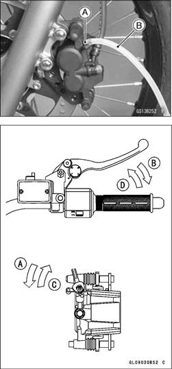 • When installing the hose, avoid sharp bending, kinking, flattening or twisting, and route the hose according to Cable, Wire and Hose Routing in the Appendix chapter. • Tighten the banjo bolts to the specified torque. Torque - Brake Hose Banjo bolts: 34 N-m (3.5 kgf-m, 25 ft-lb) • Bleed the brake line after installing the brake hose. Brake Fluid Change • Level the brake fluid reservoir. • Remove the reservoir cap. • Remove the rubber cap from the bleed valve [A] on the caliper. • Attach a clear plastic hose [B] to the bleed valve, and run the other end of the hose into a container. Fill the reservoir with fresh specified brake fluid. • Change the brake fluid as follows: • Repeat this operation until fresh brake fluid comes out from the plastic hose or the color of the fluid changes.